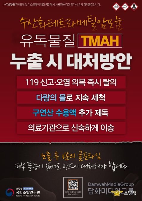 TMAH는 피부에 접촉하기만 해도 치명적인 독성을 일으킬 수 있는 고위험 물질이다. 최근 산업 현장에서 TMAH 누출로 인한 치명적인 인명피해가 지속적으로 발생함에 따라, 사업장 내 근로자와 관리자가 초기 대응 방법을 정확히 숙지하여 피해를 원천 차단(제로화)하기 위해 이번 예방 홍보물(리플릿)이 제작됐다.