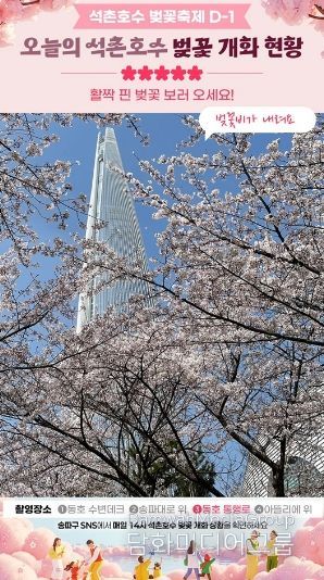 서울 송파구는 오는 4월 3일부터 11일까지 석촌호수에서 개최하는 '호수벚꽃축제'를 맞이하여, 벚꽃 개화 현황을 SNS로 실시간 중계하는 ‘벚꽃 개화 카운트다운’ 서비스를 운영한다.