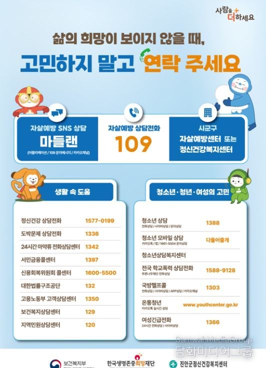 한편, 주변에 우울감으로 힘들어하거나 말하기 어려운 고민이 있어 고통받는 가족·지인이 있다면 자살예방 상담전화(109) 또는 정신건강 위기상담전화를 통해 24시간 전문가의 상담을 받을 수 있다.