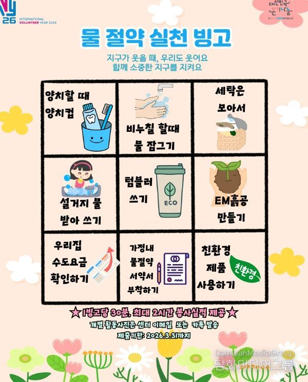 시민행정신문 강갑수 기자 | 강화군자원봉사센터가 2026년 한마음 가족봉사단의 1차 활동으로 재택 자원봉사 프로그램인 '물 절약 실천 빙고'를 운영했다고 밝혔다.