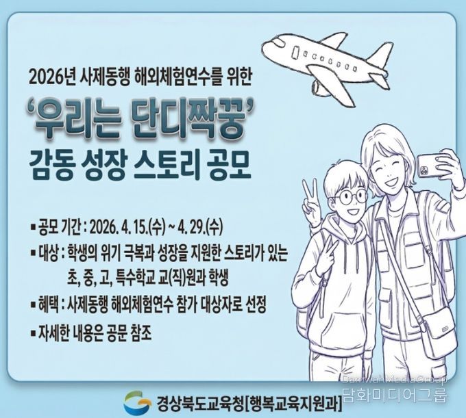 시민행정신문 기자 | 경북교육청은 사제간 감동적인 성장 이야기를 발굴하기 위해 ‘우리는 단디짝꿍’ 감동 성장 스토리 공모를 실시하고, 이를 통해 2026년 사제동행 해외체험연수 대상자를 선정한다고 6일 밝혔다.