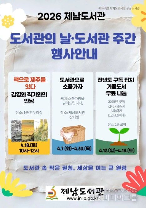 2026년 도서관의 날·도서관주간은 ‘도서관 속 작은 펼침, 세상을 여는 큰 열림’을 주제로 일상 속에서 책과 문화를 즐길 수 있도록 △도서관으로 소풍 가자! △전년도 잡지 및 기증도서 무료 나눔 △책으로 제주를 잇다 등 다양한 프로그램을 마련했다.