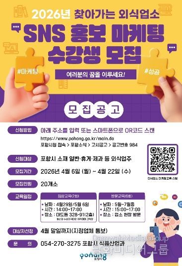 시민행정신문 강갑수 기자 | 포항시는 지역 외식업소의 자생력과 온라인 홍보 역량 강화를 위해 ‘2026년 찾아가는 외식업소 SNS 마케팅 교육’ 참여 업소를 모집한다.
