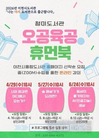 시민행정신문 기자 | 이천시 청미도서관은 이천시 도서관의'나는 다시 도서관으로 출근합니다'와 연계한 '오공육공 휴먼북'을 운영한다. 이번 행사는 은퇴 세대의 풍부한 사회 경험과 전문 지식을 지역사회의 교육 자원으로 활용하고 청소년과 청년과의 소통을 통해 지역 멘토로서의 역할을 확대하고자 기획됐다.