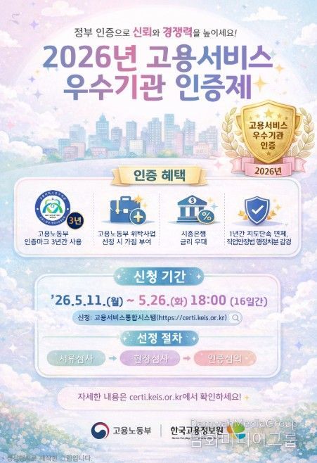시민행정신문 강갑수 기자 | 고용노동부와 한국고용정보원은 4월 8일 전국 유·무료 직업소개소와 직업정보제공사업체를 대상으로 '2026년 고용서비스 우수기관 인증제' 사업 시행 계획을 공고했다.