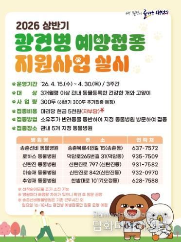 시민행정신문 김학영 기자 | 대전 대덕구가 반려동물 전염병 예방과 구민 복지 증진을 위해 오는 4월 15일부터 30일까지 ‘2026년 상반기 광견병 예방접종 지원사업’을 실시한다.