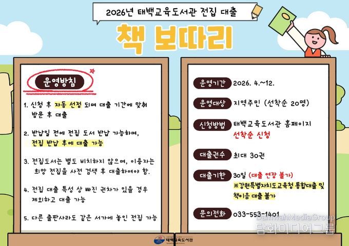 시민행정신문 기자 | 태백교육도서관(관장 정미라)은 4월부터 12월까지 지역주민을 대상으로 전집 대출 ‘책 보따리’ 프로그램을 운영한다.