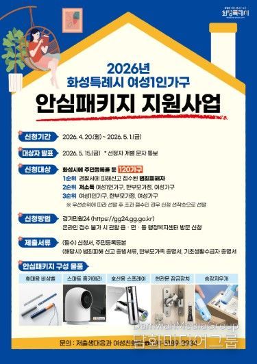 시민행정신문 강갑수 기자 | 화성특례시는 범죄 대응에 취약한 여성 1인가구 등 사회적 약자의 안전한 생활을 지원하기 위해 ‘2026년 여성1인가구 안심패키지 지원사업’을 추진하고 대상자를 모집한다고 밝혔다.