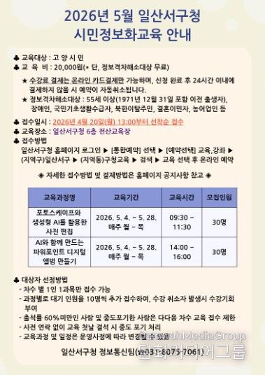교육은 5월 4일부터 5월 28일까지 매주 월요일부터 목요일까지 진행되며, 과정별 30명을 모집한다. 교육 장소는 일산서구청 6층 전산교육장이다.