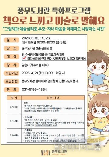 시민행정신문 기자 | 김포시 풍무도서관은 가정의 달을 맞아 만 4~5세 어린이를 둔 김포가족을 대상으로 ‘책으로 느끼고 미술로 말해요’를 오는 5월 12일부터 5월 26일까지 매주 화요일 오후 4시부터 6시까지 총 3회에 걸쳐 운영한다.