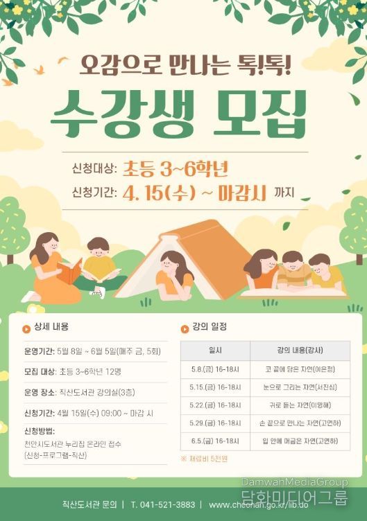 시민행정신문 강갑수 기자 | 천안시 직산도서관은 내달 8일부터 어린이와 함께하는 ‘오감으로 만나는 톡! 톡!’을 운영한다고 16일 밝혔다.