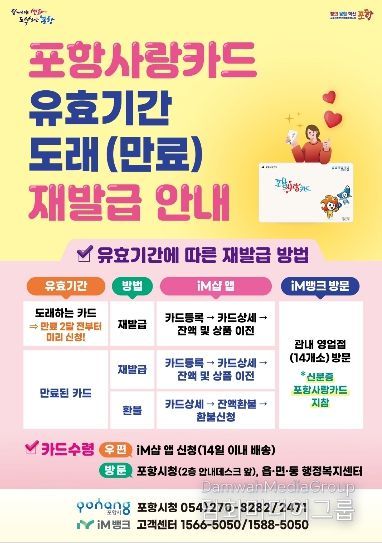카드 재발급과 잔액 이전은 포항사랑상품권 모바일 앱 ‘iM샵’ 또는 iM뱅크 영업점 방문을 통해 가능하다.