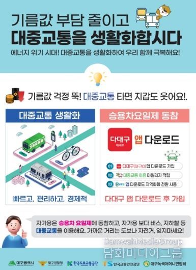 시민행정신문 강갑수 기자 | 대구광역시는 중동발 에너지 위기가 지속됨에 따라 에너지 절약 분위기를 확산하고 시민들의 동참을 이끌어내기 위해 ‘범시민 대중교통 이용 활성화 캠페인’을 전개했다.