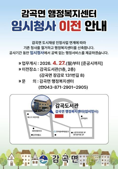 최병원 감곡면장은 “현 청사 부지에 공사가 진행됨에 따라 사업 준공 전까지 주민 불편을 최소화하고 원활한 민원 서비스를 제공하기 위해 임시청사로 이전하게 됐다”며 “행정서비스 제공에 공백이 없도록 최선을 다하겠다”고 말했다.