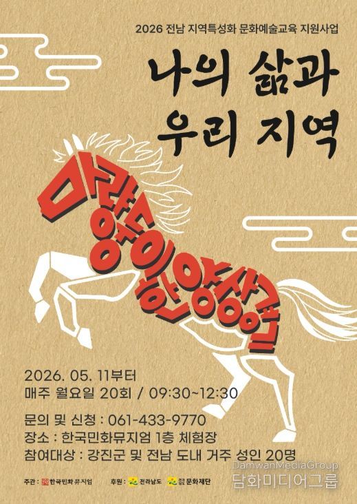 시민행정신문 강갑수 기자 | 강진군 대구면에 있는 한국민화뮤지엄이 ‘2026 지역특성화 문화예술교육 지원사업’ 선정에 따라 오는 5월 11일부터 ‘나의 삶과 우리 지역–마량둥이의 한양 상경기’ 프로그램 운영을 시작하며 참가자를 모집한다.