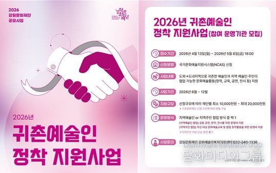 시민행정신문 강갑수 기자 | 강원문화재단은 귀촌예술인의 안정적인 지역 정착과 지역문화 활성화를 위해 '2026년 귀촌예술인 정착 지원사업' 운영기관을 오는 5월 8일까지 공개 모집한다.