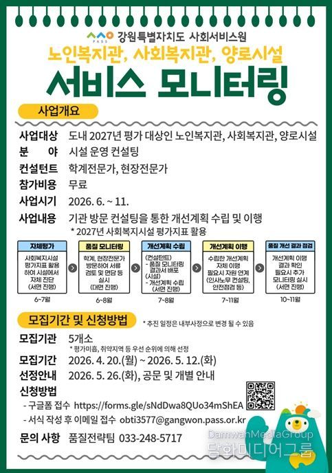 시민행정신문 기자 | 강원특별자치도 사회서비스원은 도내 사회복지시설의 서비스 품질 향상과 사회서비스 품질 표준화 체계 구축을 위해 오는 6월부터 ‘서비스 모니터링’ 사업을 추진한다.
