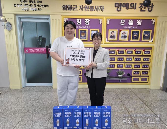 이에 영월군자원봉사센터는 엄재영 씨의 공로를 격려하고 지역사회 안전의식 확산을 위해 한국소방마이스터고등학교에서 기부한 차량용 소화기 6대를 전달했다.