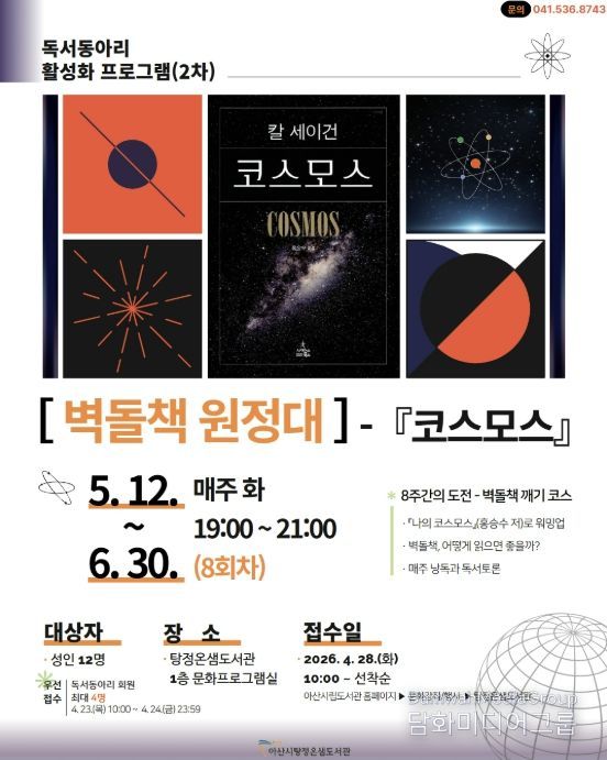 시민행정신문 강갑수 기자 | 아산시 탕정온샘도서관이 오는 5월부터 ‘벽돌책 원정대 - 『코스모스』 함께 읽기’ 프로그램을 신규 운영한다.