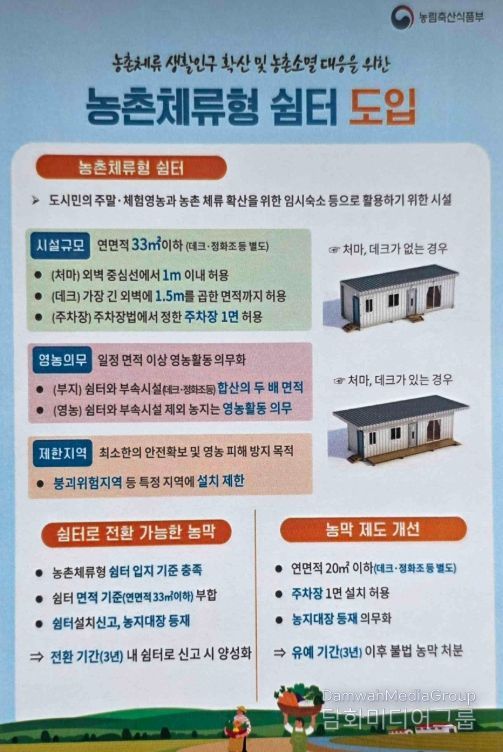 농촌체류형 쉼터는 농촌 생활인구 확산과 농촌 소멸 대응을 위해 도입된 제도로, 농업경영의 편의를 높이고 영농의 효율성을 높이는 데에도 의미가 있다.