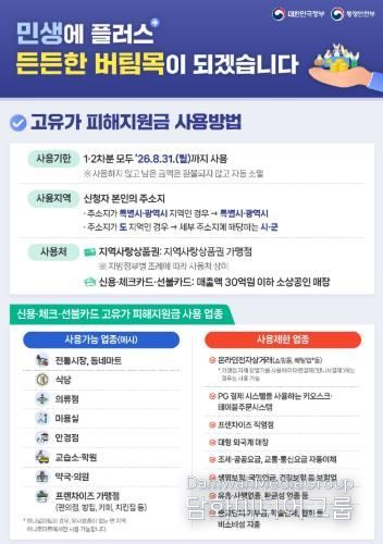 지원금은 지역경제 활성화를 위해 공주시 관내에서만 사용할 수 있으며, 전통시장과 음식점, 동네마트 등 연 매출액 30억원 이하인 소상공인 매장에서 사용 가능하다. 사용 기한은 올 8월 31일까지다.