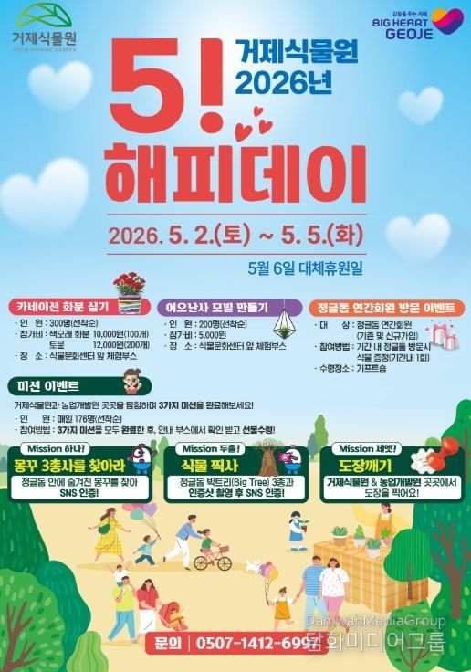 시민행정신문 강갑수 기자 | 거제시농업기술센터는 오는 5월 2일부터 5월 5일까지 거제식물원 일원에서 특별행사 ‘거제식물원 5! 해피데이’를 운영한다고 밝혔다.