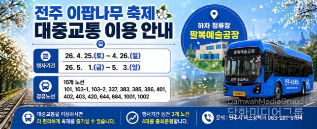 시는 올해 4월 벚꽃 개화 시기에 맞춰 만경강변 일대에 특별노선을 운영하는 등 계절별 관광수요에 대응한 교통 지원을 추진했으며, 이러한 운영 경험을 바탕으로 이번 이팝나무 축제 기간에도 교통 운영을 이어갈 계획이다.