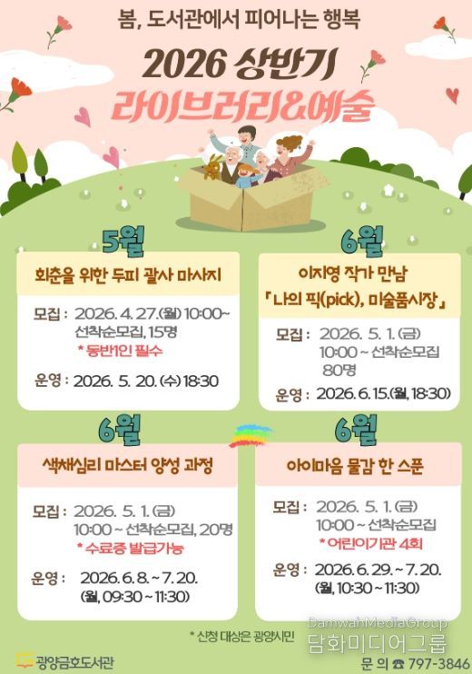 시민행정신문 강갑수 기자 | 광양금호도서관은 가정의 달을 맞아 시민들이 독서와 문화를 함께 즐길 수 있는 다양한 프로그램을 운영한다.