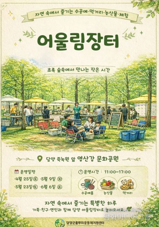 시민행정신문 강갑수 기자 | 담양군 풀뿌리공동체지원센터가 지역 공동체와 소상공인의 상생을 돕고 지역 경제를 살리기 위한 ‘2026년 어울림장터’를 오는 6월까지 총 4회 운영한다.