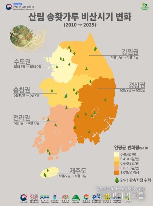 분석 결과, 2010년 이후 최근까지 소나무 화분 비산 시작일은 전국 평균 기준 매년 약 0.91일씩 앞당겨지고 있는 것으로 확인됐다. 특히 이러한 변화는 남부 권역에서 더욱 뚜렷하게 나타났으며, 지역 간 차이도 확인됐다.