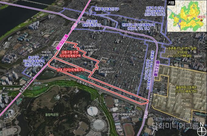 대상지는 잠실광역중심과 천호·길동 지역중심을 연결하는 축에 위치한 지역으로, 행정·주거·여가 기능이 혼재된 강동구 핵심 입지다. 특히 최근 대규모 주거단지 입주 등으로 배후 인구가 증가하면서 생활·문화 수요가 확대되고 있으나, 기존 지구단위계획은 개발 유도 한계가 있었고 더욱이 두 개의 지구단위계획으로 이원화되어 비효율이 발생해 왔다.