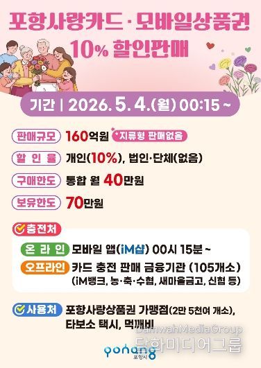 시는 올해 들어 이달까지 총 1,230억 원 규모의 포항사랑상품권을 발행한 데 이어, 이번 할인 판매분 160억 원을 유통해 지역 상권 내 소비를 촉진하고 경기 회복 흐름을 이어간다는 방침이다.