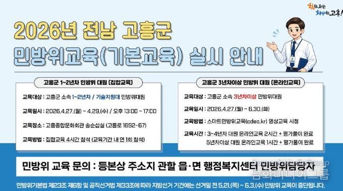 시민행정신문 강갑수 기자 | 고흥군은 민방위대원의 대응 역량을 강화하고자 2026년 상반기 민방위 기본교육을 실시한다고 밝혔다.