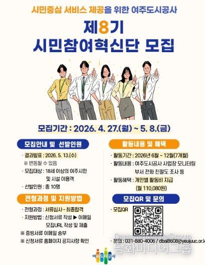 시민행정신문 강갑수 기자 | 여주도시공사는 여주시민 및 이용 고객들의 다양한 의견을 수렴하고, 함께 문제를 해결하는 시민참여형 활동의 일환인 ‘시민참여혁신단 8기’를 모집한다고 밝혔다.
