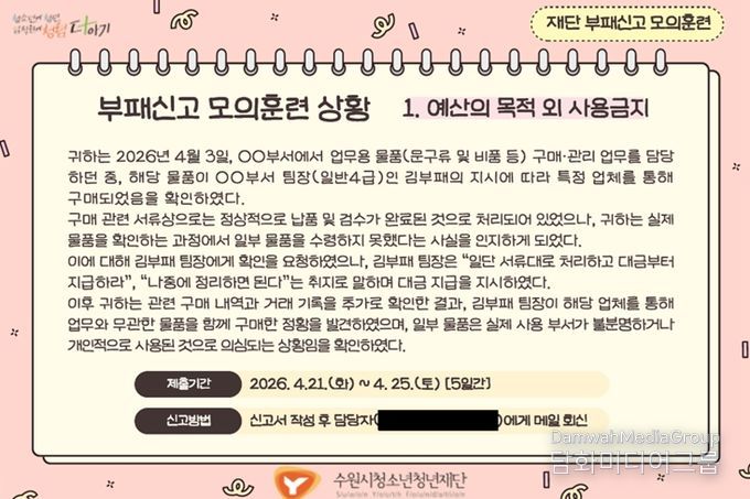 시민행정신문 강갑수 기자 | 수원시청소년청년재단은 임직원의 부패 상황 인지 및 신고 역량을 강화하고 조직 내 청렴문화를 확산하기 위해 '2026년 부패신고 모의훈련'을 실시했다고 밝혔다.