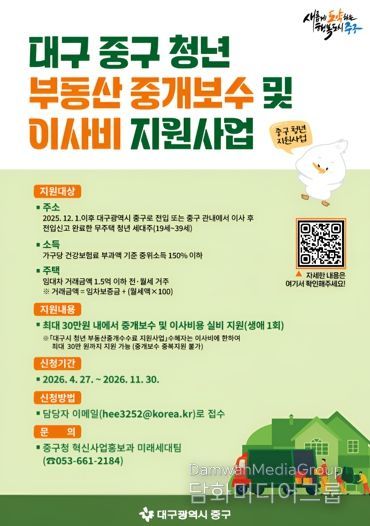 시민행정신문 강갑수 기자 | 대구 중구는 청년들의 주거비 부담을 완화하고 안정적인 지역 정착을 돕기 위해 ‘청년 부동산 중개보수 및 이사비 지원사업’을 추진한다.