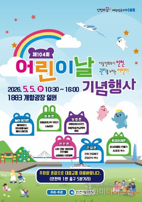 시민행정신문 강갑수 기자 | 인천광역시는 제104회 어린이날을 맞아 어린이의 권리 존중과 참여 확대를 위한 기념행사를 오는 5월 5일 오전 10시 30분부터 오후 4시까지 중구 북성동 ‘1883 개항광장 일원’에서 개최한다고 밝혔다.