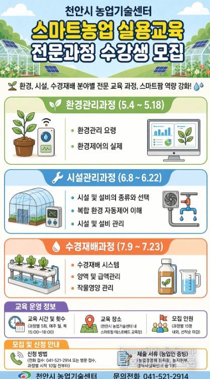 시민행정신문 강갑수 기자 | 천안시농업기술센터는 5~ 7월 ‘스마트농업 실용교육 전문과정’을 운영한다고 27일 밝혔다.