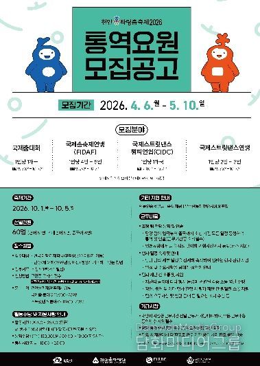 안동순 천안문화재단 대표이사는 “통역요원은 단순지원 인력을 넘어 축제의 글로벌 경쟁력을 높이는 핵심 역할”이라며 “국제 무대에서 역량을 펼치고 싶은 청년들의 적극적인 참여를 기대한다”고 말했다.