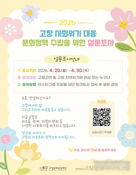 시민행정신문 강갑수 기자 | 고창문화도시센터는 고창군이 직면한 사회위기 현황과 군민 인식을 파악하기 위해 ‘2026 고창 사회위기 대응 문화정책 수립을 위한 설문조사’를 추진한다.