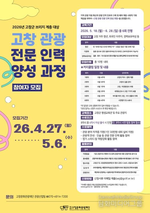 시민행정신문 강갑수 기자 | 고창문화관광재단은 27일부터 지역 관광 활성화 및 수용태세 개선을 위해 ‘2026년 관광 전문인력 양성사업’ 참여자를 모집한다고 밝혔다.