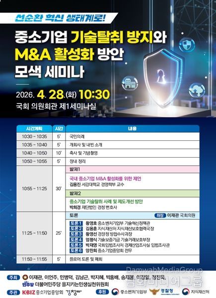 시민행정신문 이준석 기자 | 이재관 의원(충남 천안을·더불어민주당)이 오는 28일 오전 10시30분 국회 의원회관 제1세미나실에서 ‘선순환 혁신 생태계로! 중소기업 기술탈취 방지와 M&A 활성화 방안 모색 세미나’를 개최한다고 밝혔다.