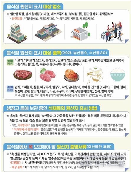 현행 원산지 표시제에 따르면 음식점은 쌀·콩·배추김치 등 농산물 3종과 쇠고기·돼지고기·닭고기 등 축산물 6종, 넙치·고등어·갈치 등 수산물 20개 품목에 대해 원산지를 의무적으로 표시해야 한다.