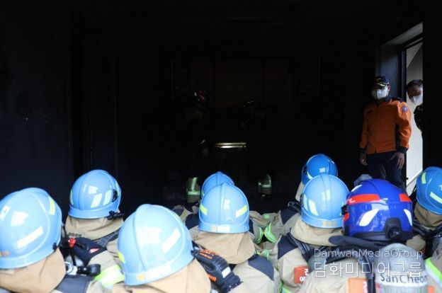 지휘부는 개인안전장비를 착용하고 실물화재 교육시설 내부에 진입해 가연성가스발화(FGI), 플래시오버(Flashover) 등 고위험 화재 이상현상을 체감하며, 고도화된 훈련 과정의 실효성과 현장 지휘 전술 운용 절차를 재점검했다.