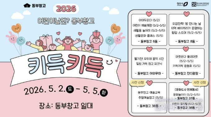 시민행정신문 기자 | 청주시와 청주시문화산업진흥재단은 가정의 달 5월을 맞아 오는 5월 2일부터 5일까지 동부창고 일원에서 어린이날 행사 ‘키득키득’을 연다.