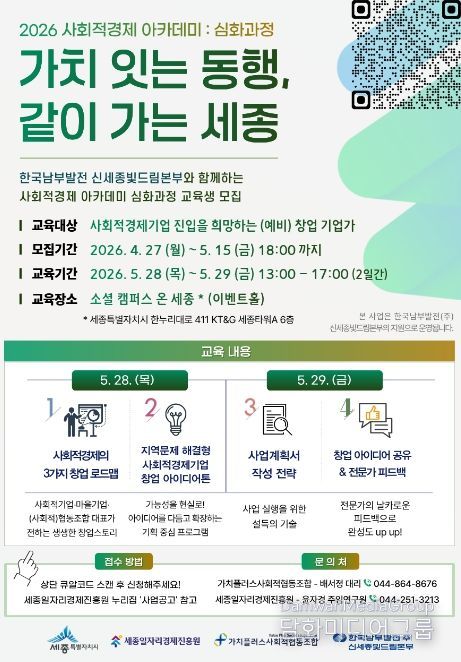 시민행정신문 강갑수 기자 | 세종일자리경제진흥원이 한국남부발전(주) 신세종빛드림본부와 협력해 사회적경제 창업 실행 역량 강화를 위한 ‘2026 사회적경제 아카데미 심화과정’ 참여자를 모집한다.