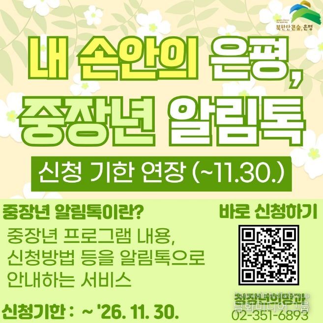 시민행정신문 강갑수 기자 | 서울 은평구는 중장년층의 정보 접근성을 높이고 프로그램 참여 기회를 확대하기 위해 ‘내 손안의 은평, 중장년 알림톡’ 서비스 신청 기간을 연장한다고 밝혔다.