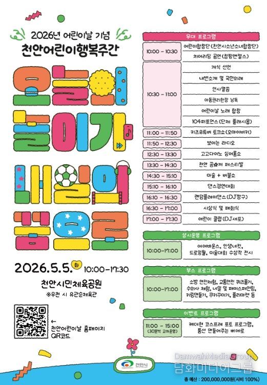 시민행정신문 강갑수 기자 | 천안시는 제104회 어린이날을 맞아 5월 1일부터 5일까지 ‘2026 천안어린이 행복주간’을 운영한다고 28일 밝혔다.