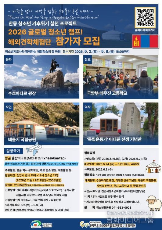시민행정신문 강갑수 기자 | 천안시청소년재단 산하 천안시청소년복합커뮤니티센터가 청소년의 글로벌 역량 강화를 위해 ‘2026 청소년 국제교류 캠프’ 몽골 탐방 참가자를 모집한다.
