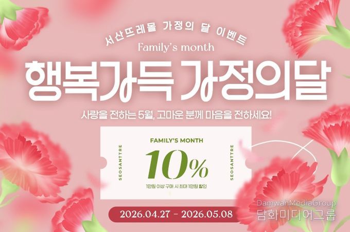 서산뜨레몰에서는 5월 8일까지 전 품목 구매 시 사용할 수 있는 10% 할인쿠폰(최대 1만 원 할인)을 제공한다.